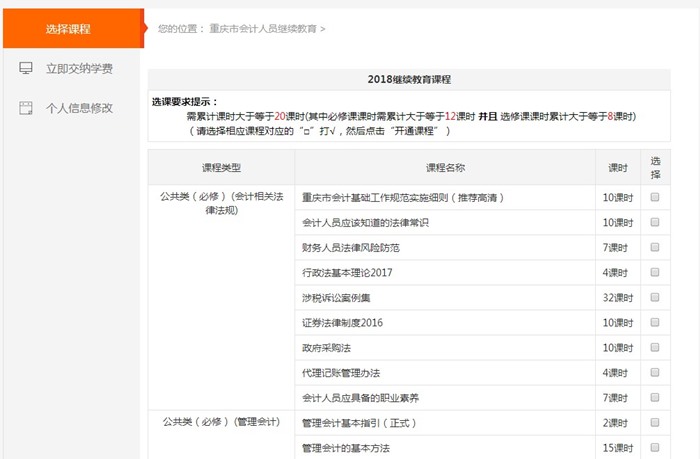 系统自动累计学习时间,根据重庆市会计继续教育要求,学员每年必须完成24学时的内容(必修12学时,选修8学时;另外考试时间为4学时,总计24学时。);