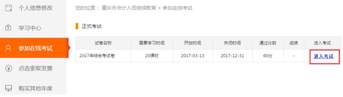 学满课时后,点击“参加在线考试”进入考试系统,60分及以上者,视为合格;
